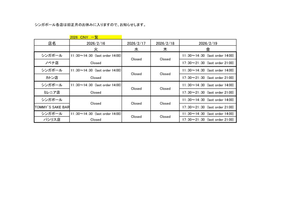 【シンガポール各店】営業日変更のお知らせ