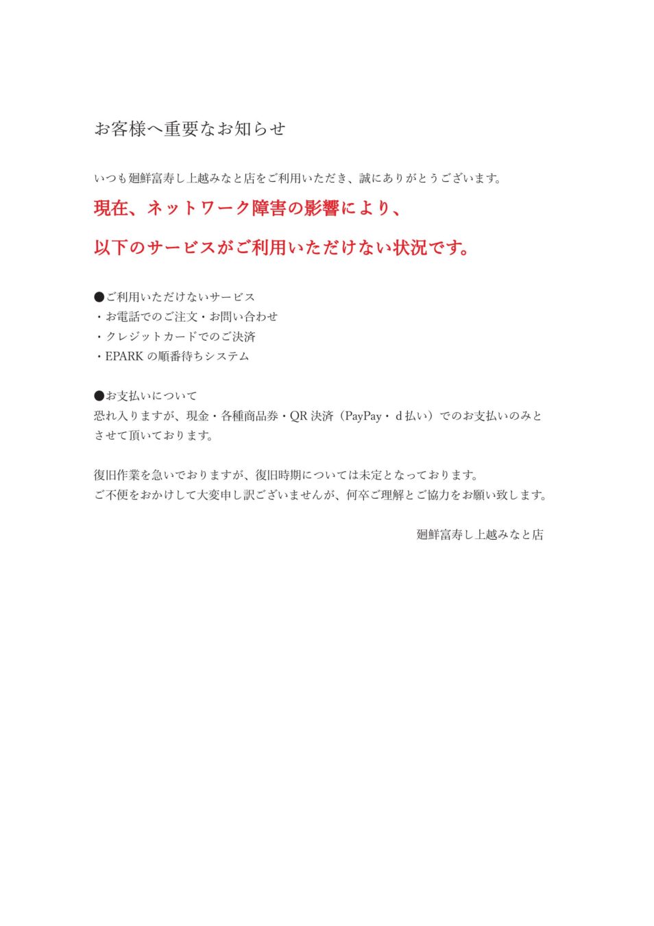 【廻鮮富寿し上越みなと店】ネットワーク障害のお知らせ