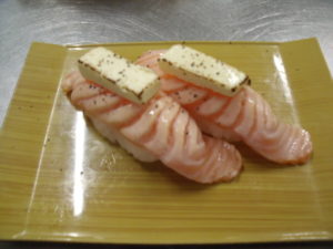炙りサーモンチーズ握り2貫 385円