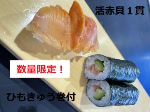 ☆活赤貝一貫~ひもきゅう巻付~ 660円