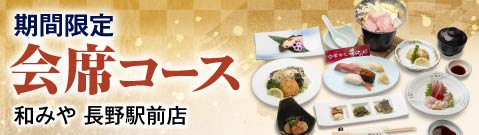 信州の観光拠点JR長野駅より徒歩1分の立地。ながの東急様とも隣接しており、お買物の行き帰りはもちろん、お仲間とのランチタイム、夜のご宴会、会食接待等にも最適です。 本格派向けのお客様にもご満足いただける広々としたカウンターは、お一人様でもお気軽にお食事ができるようになっており、ペア席やボックス、小部屋(個室)も用意しております。また、大宴会場は、最大50名様迄のご宴会も承っております。さまざまなご宴会にご利用くださいませ。